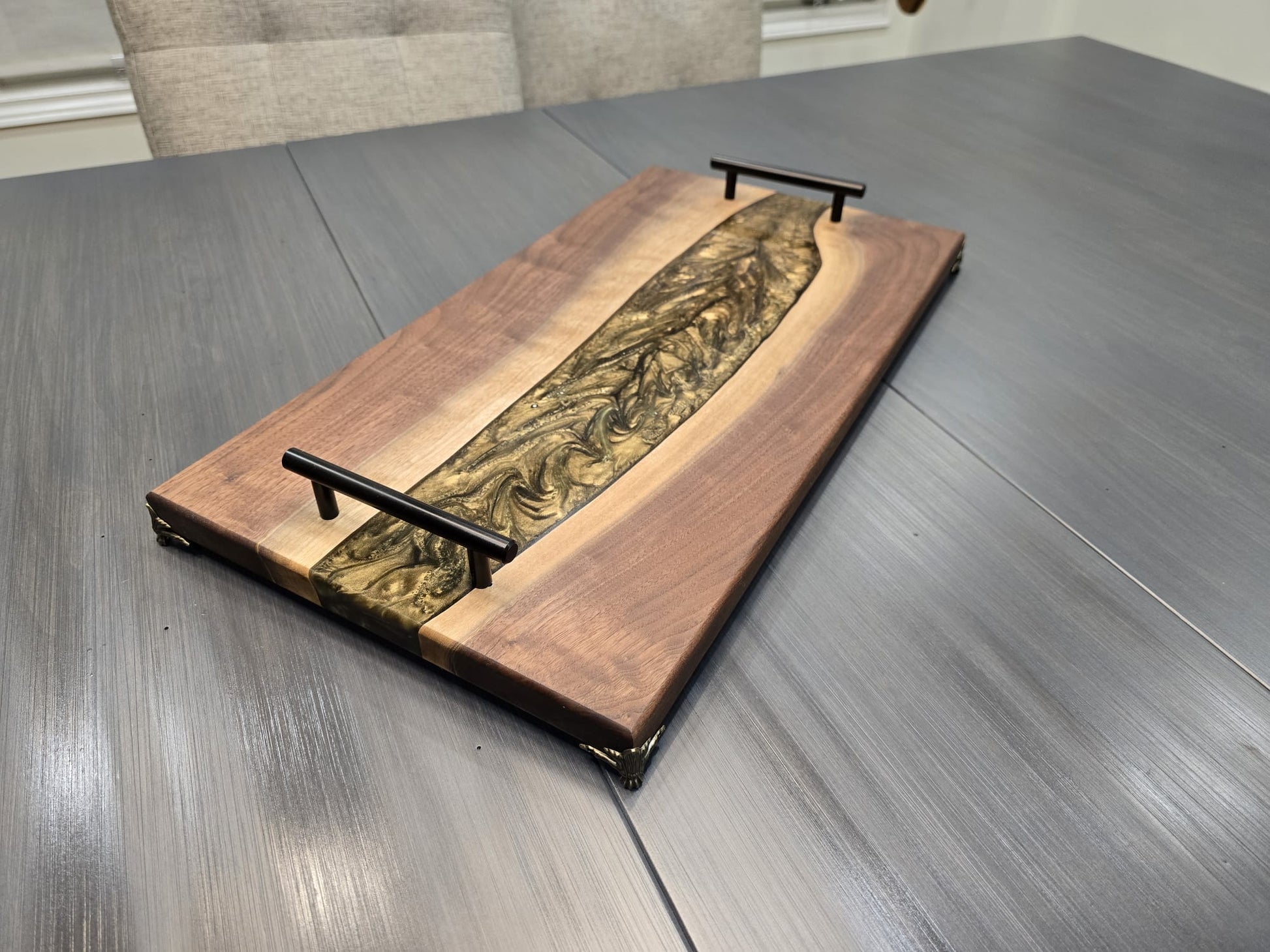 Black walnut decorative tray and charcuterie board with a beautiful golden-brown epoxy deep pour.